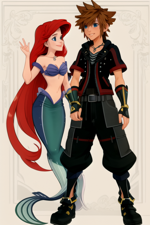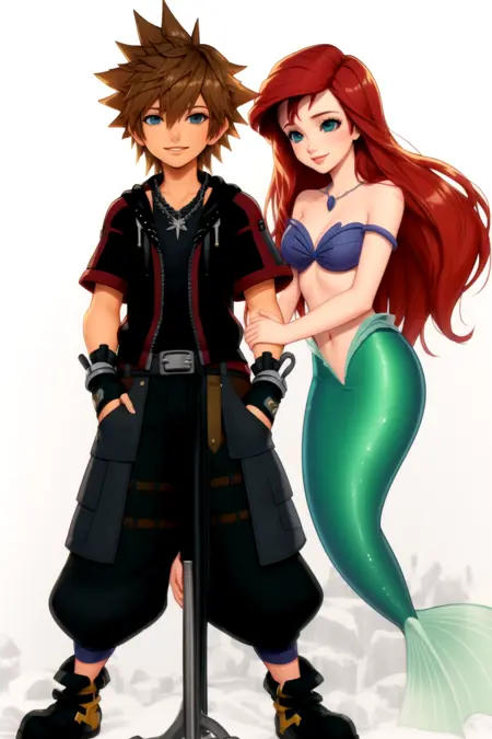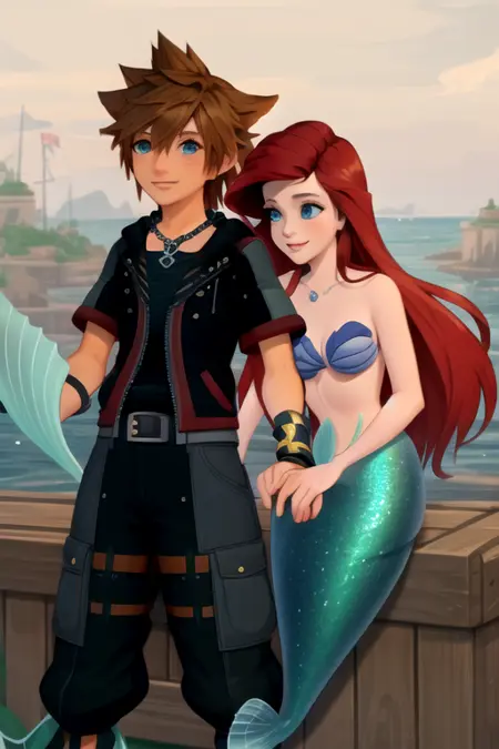 SoraAriel, a man and a mermaid, hetero, standing, smile, cowboy shot