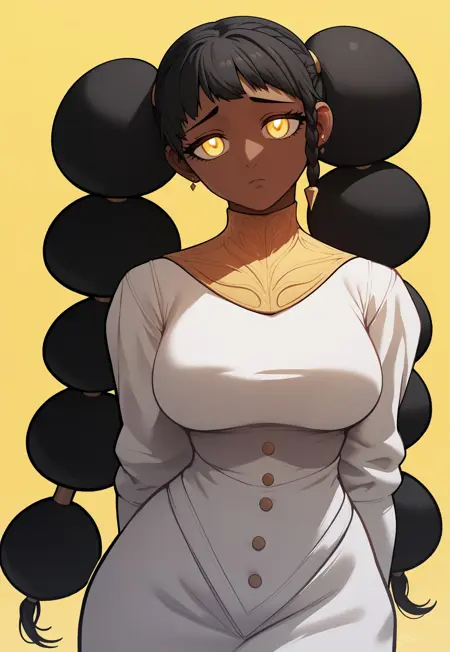 desscaras, dark-skinned female, very dark skin, yellow eyes, black hair, long hair, twintails, bubble braids, bangs, hair buns, large breasts, earrings, jewelry, black gloves, white dress, baggy pants, black shoes