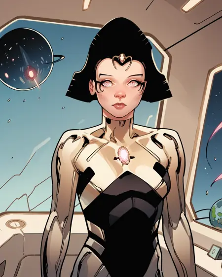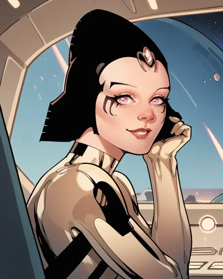 Triggers: xandra, black hair, bodysuit, pink eyes, makeup
