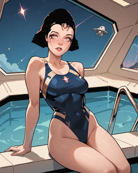 트리거: _xandra, 검은 머리, 바디수트, 분홍색 눈, 메이크업
