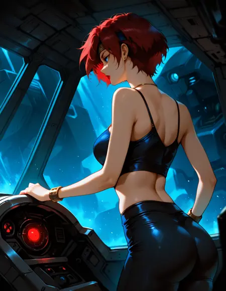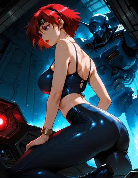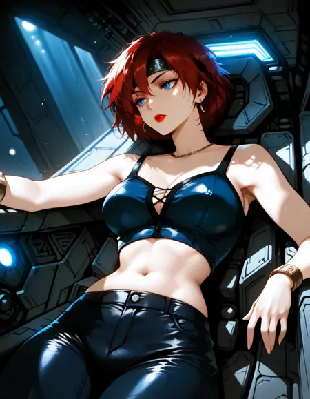 crop top, forehead protector, jewelry, tight pants, bracelet,