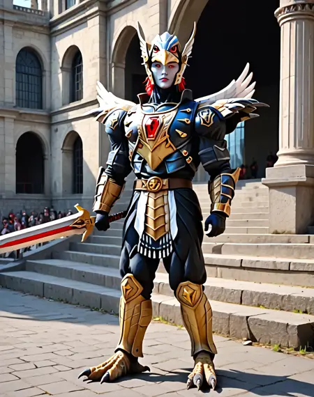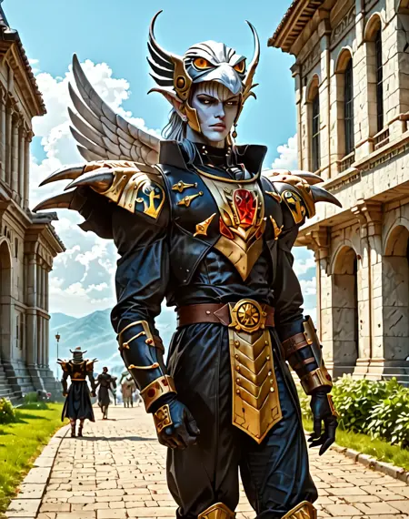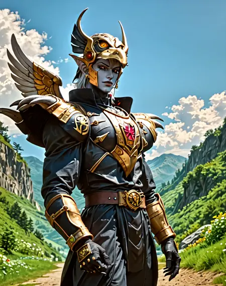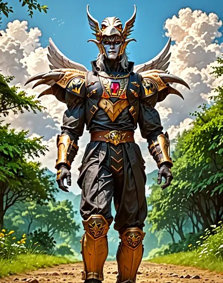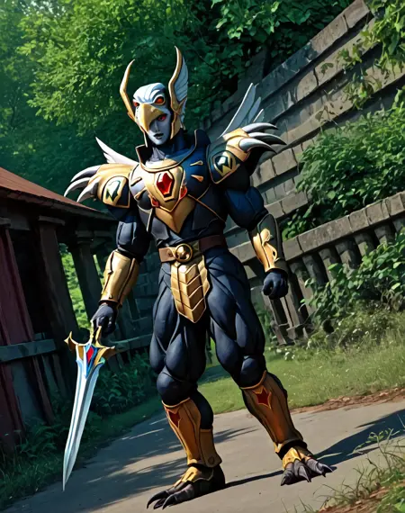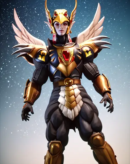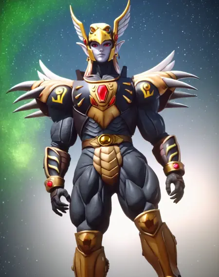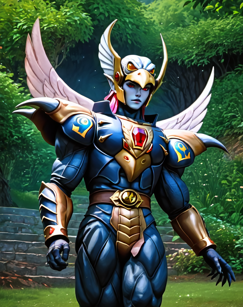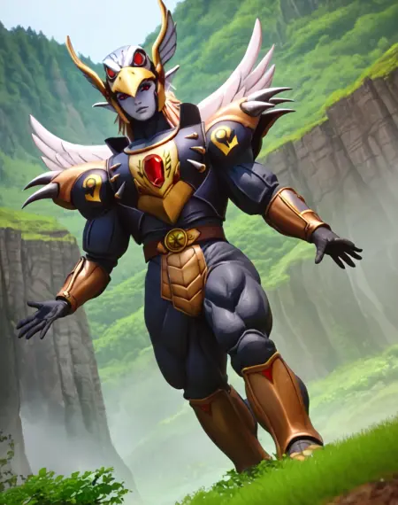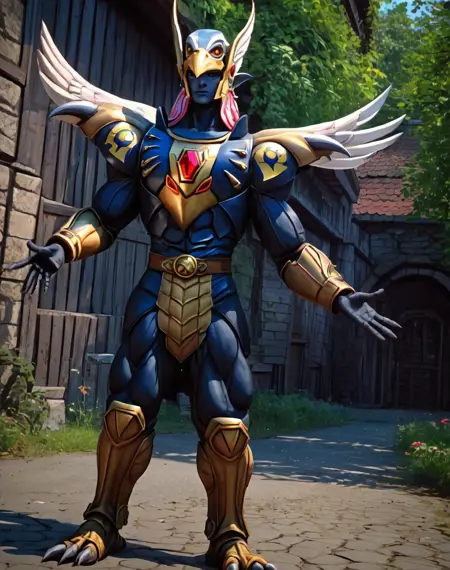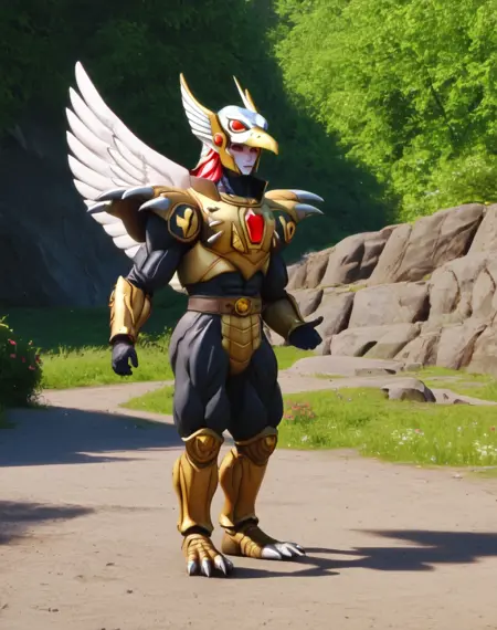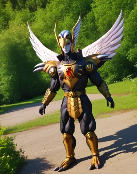 可添加其他提示词如(实心红眼睛,装甲,黑色皮肤,宽厚胸膛,裸露的肌肉手臂,裸露的肌肉双腿,完美比例,小脑袋,猎鹰头,猎鹰主题装甲,猎鹰头盔,鸟爪,长腿,以《特警力量救援》中的怪物风格呈现,超级战队怪物),以帮助更好地呈现其外观。许多检查点不擅长表现他应有的样子,通常会添加衣物或改善比例。