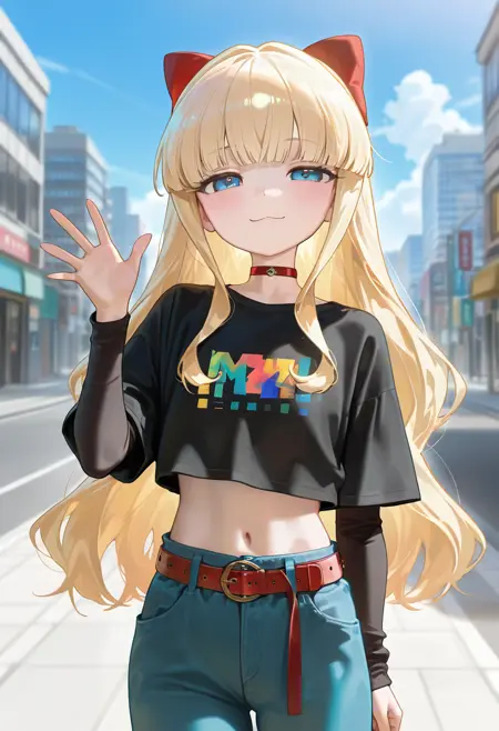 彼女の外見タグ: 1girl, solo, long hair, blue eyes, blonde hair, very long hair, medium breasts, hair bow, blunt bangs,
