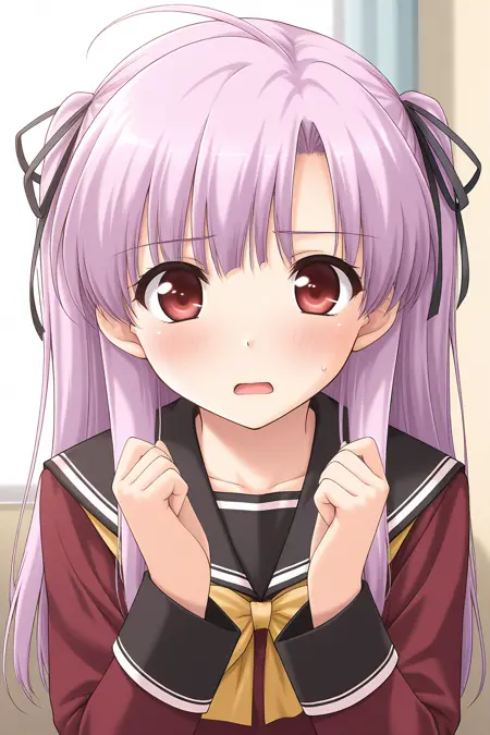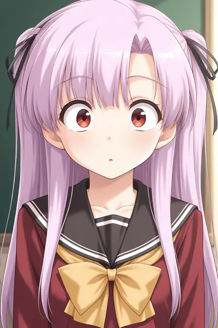 shingyouji mao,red eyes,purple hair,long hair,twintails,two side up,hair ribbon,black ribbon,