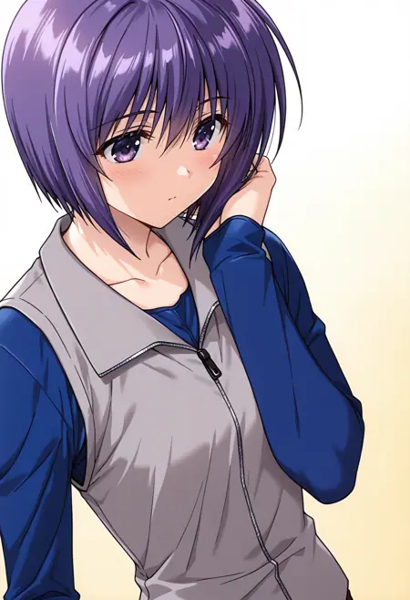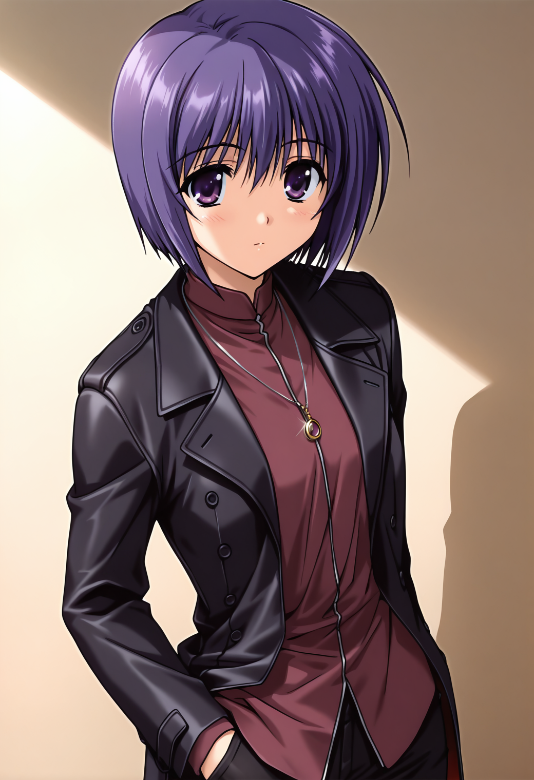 haga_reiko, reiko_casual1, purple hair, short hair, purple eyes, breasts,