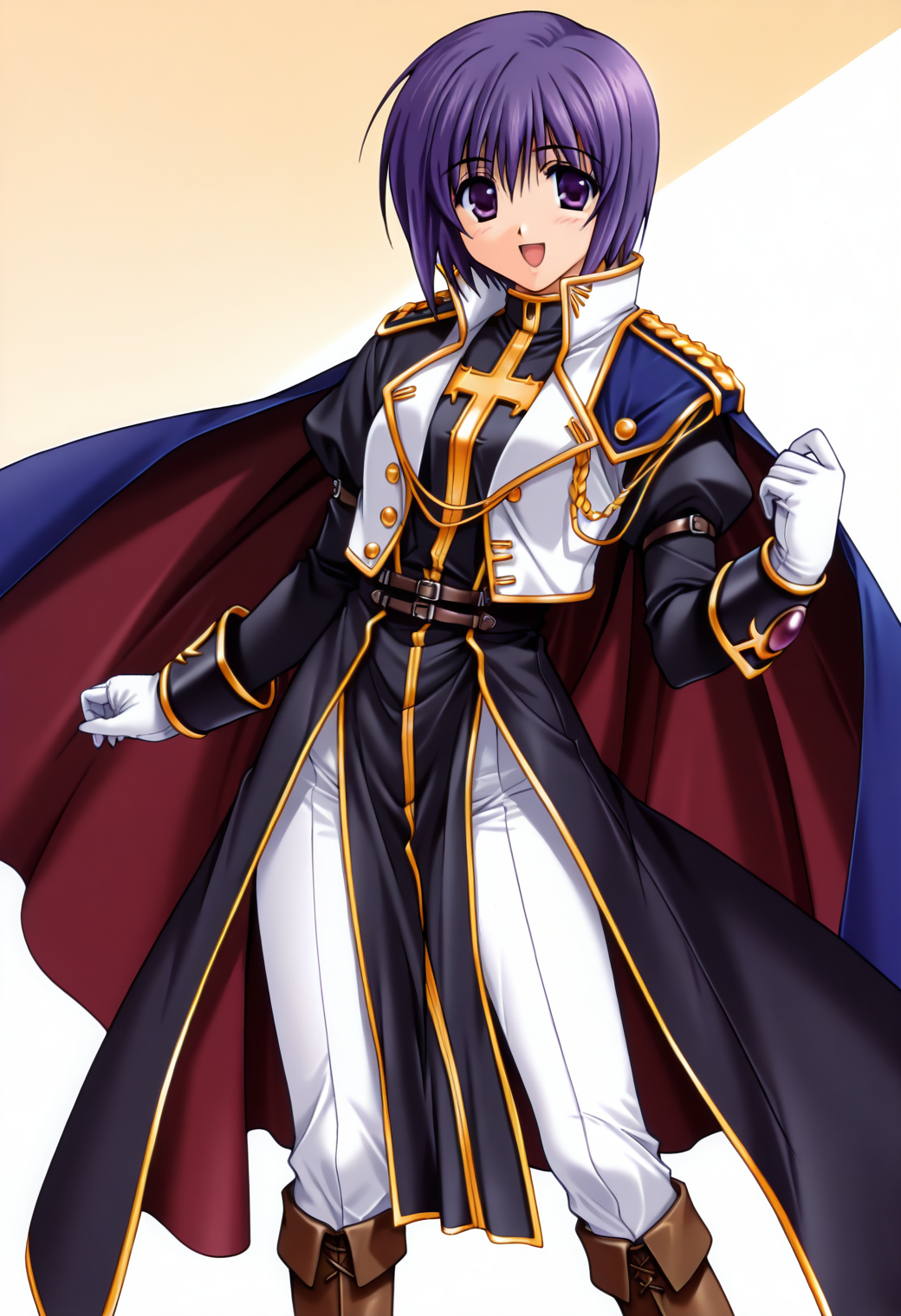 military uniform, long coat, cape, white gloves, pelvic curtain, white pants, brown boots