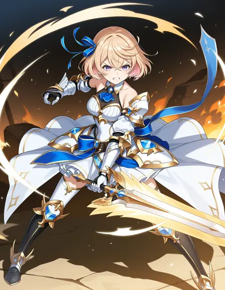 복장: 흰 드레스, 갑옷, 플레이트 아머, 어깨 노출, 장갑, 겐틀렛, 갑옷 드레스