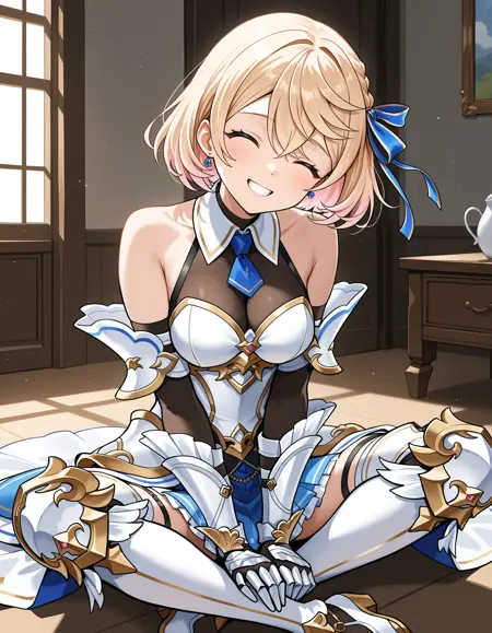 shironeko project,eleanor \(shironeko project\),blonde hair,bob cut,hair between eyes,hair ribbon,blue ribbon,purple eyes,medium breasts