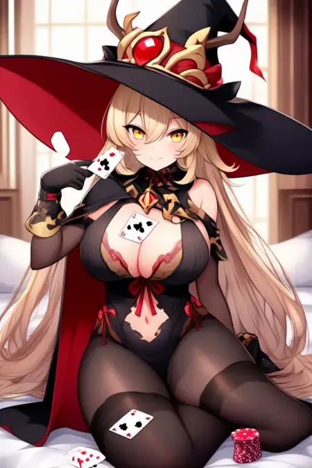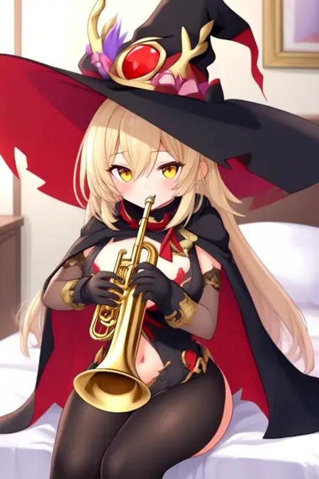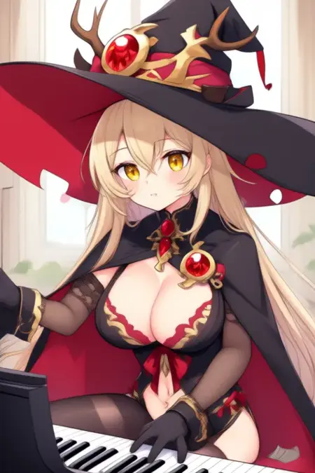 트리거 단어: Nui Sociere, 애니메이션 스타일 소녀. 이미지는 어깨를 넘는 긴 금발 머리를 가진 애니메이션 스타일 캐릭터를 특징으로 합니다. 머리는 느슨한 물결무늬로 스타일링되어 약간 흐트러진 듯한 외관을 줍니다. 캐릭터는 피부톤에 두드러지게 떨어지는 크고 표현력 풍부한 노란색 눈을 가지고 있습니다. 캐릭터의 복장은 빨간 액센트가 있는 검은색 옷으로 구성되어 있으며, 목선에 빨간 리본이 달린 높은 칼라 상의, 검은 장갑, 검은 부츠가 포함됩니다. 복장에는 빨간 리본과 장식 요소가 더해져 정교한 디자인을 완성합니다. 캐릭터는 빨간 보석과 사슴 뿔로 장식된 넓은 모자와 함께 착용하고 있어 외관에 기발한 분위기를 더합니다. 망토는 주로 빨간색이며 검은색 테두리가 있고, 빨간 보석과 장식용 리본이 달린 넓은 모자를 씌웠습니다. 캐릭터의 다리는 검은 스타킹으로 덮여 있으며, 금색 액센트가 있는 검은 부츠를 신고 있습니다.