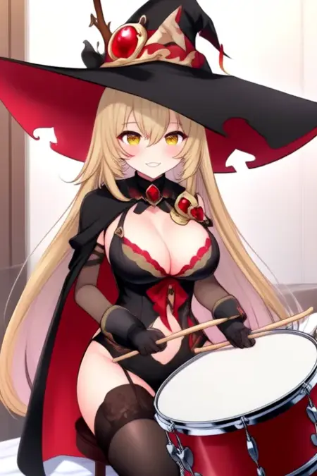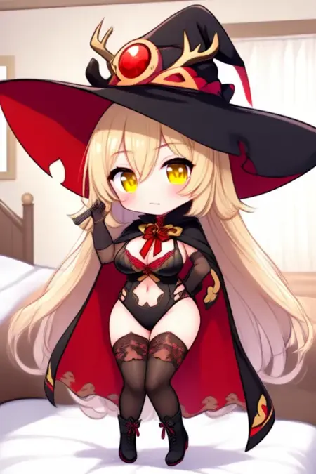 샘플 프롬프트: Nui Sociere, 애니메이션 스타일 소녀. 이미지는 어깨를 넘는 긴 금발 머리를 가진 애니메이션 스타일 캐릭터를 특징으로 합니다. 머리는 느슨한 물결무늬로 스타일링되어 약간 흐트러진 듯한 외관을 줍니다. 캐릭터는 피부톤에 두드러지게 떨어지는 크고 표현력 풍부한 노란색 눈을 가지고 있습니다. 캐릭터의 복장은 빨간 액센트가 있는 검은색 옷으로 구성되어 있으며, 목선에 빨간 리본이 달린 높은 칼라 상의, 검은 장갑, 검은 부츠가 포함됩니다. 복장에는 빨간 리본과 장식 요소가 더해져 정교한 디자인을 완성합니다. 캐릭터는 빨간 보석과 사슴 뿔로 장식된 넓은 모자와 함께 착용하고 있어 외관에 기발한 분위기를 더합니다. 망토는 주로 빨간색이며 검은색 테두리가 있고, 빨간 보석과 장식용 리본이 달린 넓은 모자를 씌웠습니다. 캐릭터의 다리는 검은 스타킹으로 덮여 있으며, 금색 액센트가 있는 검은 부츠를 신고 있습니다, (그녀가 춤추고 있음:2.5), (치비 넌도로이드:3.5) 침실에서.