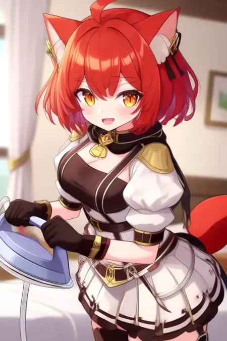 サンプルプロンプト: Ratna Petit, anime-style girl. The image features an anime-style character with vibrant red hair styled in a messy, voluminous manner with a bow. The character has large, expressive eyes with a mix of black and yellow hues, giving them a striking appearance. The hair is adorned with small, gold hairpin.The character's clothing includes a black and white outfit with gold accents. The top is a short-sleeved shirt with a high collar, featuring a prominent emblem on the chest. The character also wears black gloves and boots, which have gold details matching the overall color scheme. The outfit appears to be part of a uniform or costume, suggesting a military or ceremonial theme.The character is wearing a detailed outfit consisting of a brown and white top with a high collar, a matching skirt with multiple straps and buckles, and thigh-high boots with a red accent at the bottom, (she is dancing:2.5), (chibi Nendoroid:3.5) in bedroom.