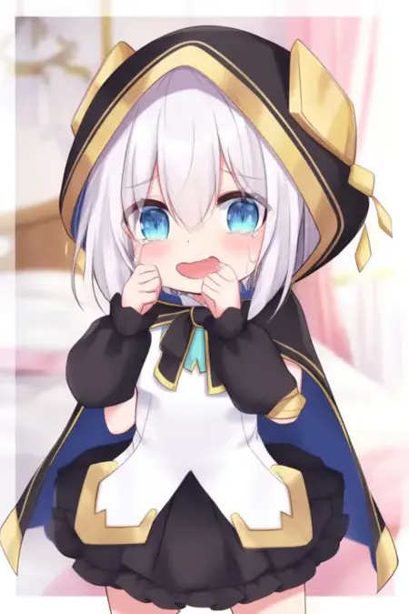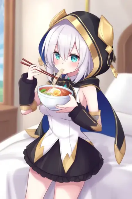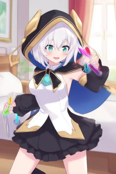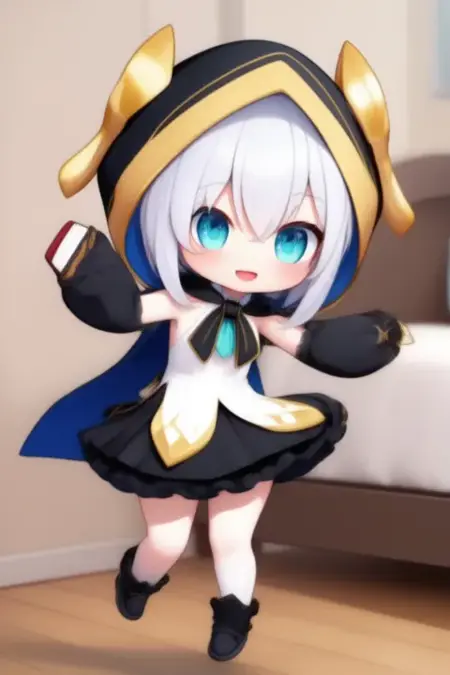샘플 프롬프트: Ars Almal, 애니메이션 스타일 소녀. 이미지는 흰색 머리카락을 두 개의 단발머리로 묶은 애니메이션 스타일 캐릭터를 특징으로 합니다. 캐릭터는 파란 눈을 가지고 있으며, 고양이 귀가 달린 모자를 포함한 검은색과 금색 옷을 입고 있습니다. 옷은 흰색 블라우스에 검은색 소매, 프릴이 있는 검은 치마, 그리고 검은 장갑으로 구성되어 있으며, (그녀는 춤추고 있음:2.5), (치비 넌도로이드:3.5) 침실에서.