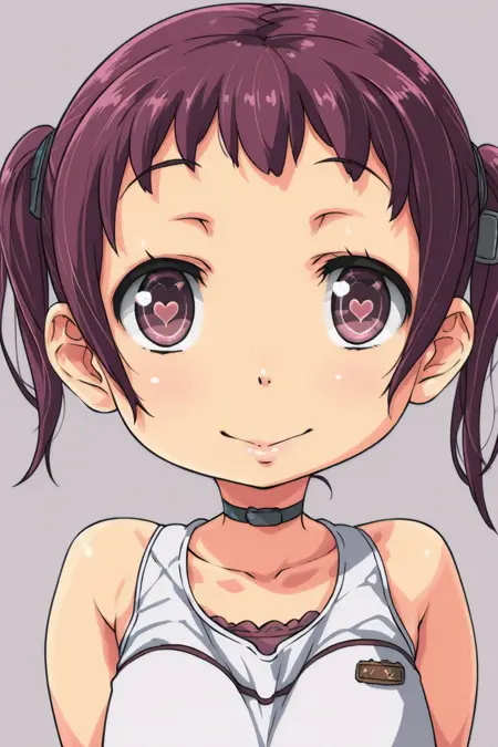 キャラクタープロンプト: 宮内ひな、1人Girl、大きな胸、紫髪、紫目、ハートの目、ショートヘア、ツインテール、ふっくらした体型