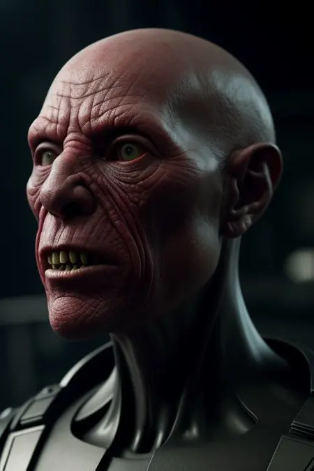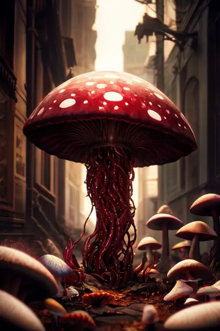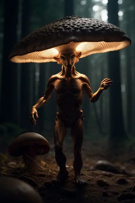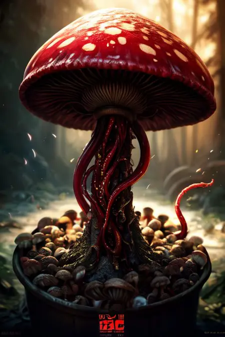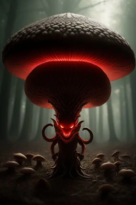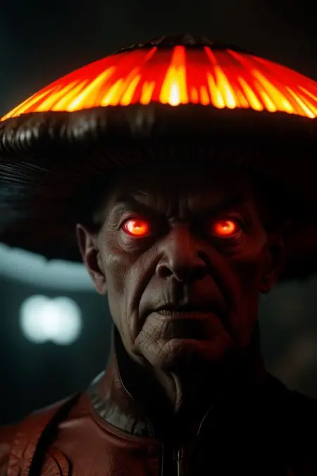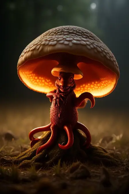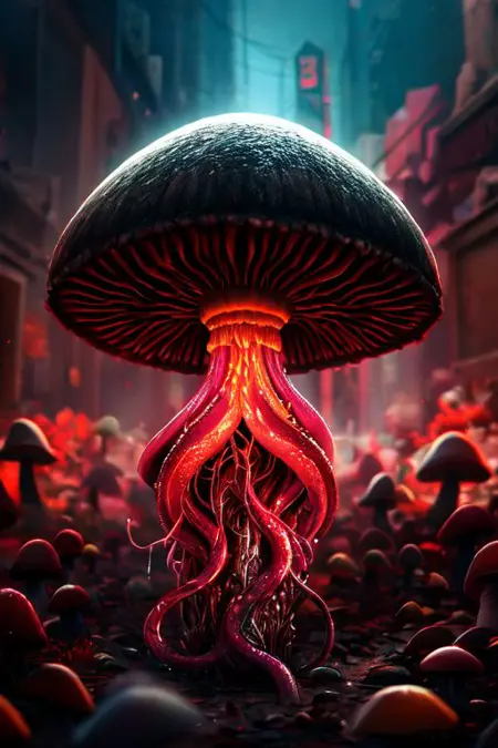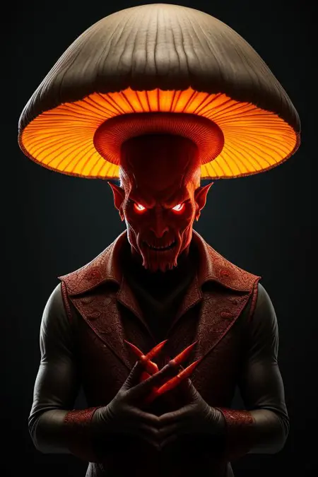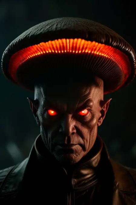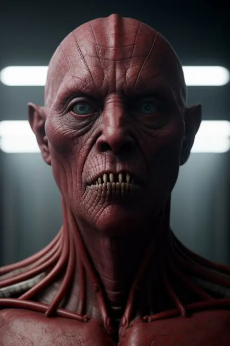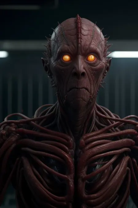 一个超凡脱俗、类人形的寄生生物、病毒、恶魔形象,挺立于宁静的生物发光怀抱中。其皮肤是由晶莹剔透的蓝色与绿色构成的精致网状结构,散发出柔和而异界的光芒,显现出脉动着内在光辉的复杂血管纹路。双眼大而杏仁状,虹膜泛着荧光,仿佛蕴藏着宇宙的奥秘,将观者引入一片宁静的凝视之中。从其头部垂落的发丝状触须如一场迷人的芭蕾般舞动,每一根细丝都微微闪烁,仿佛拥有自己的意志。身披半透明有机织物制成的飘逸长袍,此形象与周围景观融为一体——构成一幅奇异的有机结构与起伏形态的挂毯。背景是一幅充满活力的活色生香之画,发光的河流如血管般蜿蜒穿过大地,这些类似血管的水道泛着柔和的蓝色荧光,滋养着土地,为整个场景营造出氛围。生物发光的神秘植物与真菌群落遍布景观,投射出斑驳的绿蓝光影,交织成一场光与影的交响曲。该形象既神秘又和谐,仿佛自这异界世界的本质中诞生,成为其沉默的守护者。此景是对生命与非生命、自然的科技以及生命在最非凡形态下的美的礼赞。红色霓虹光晕