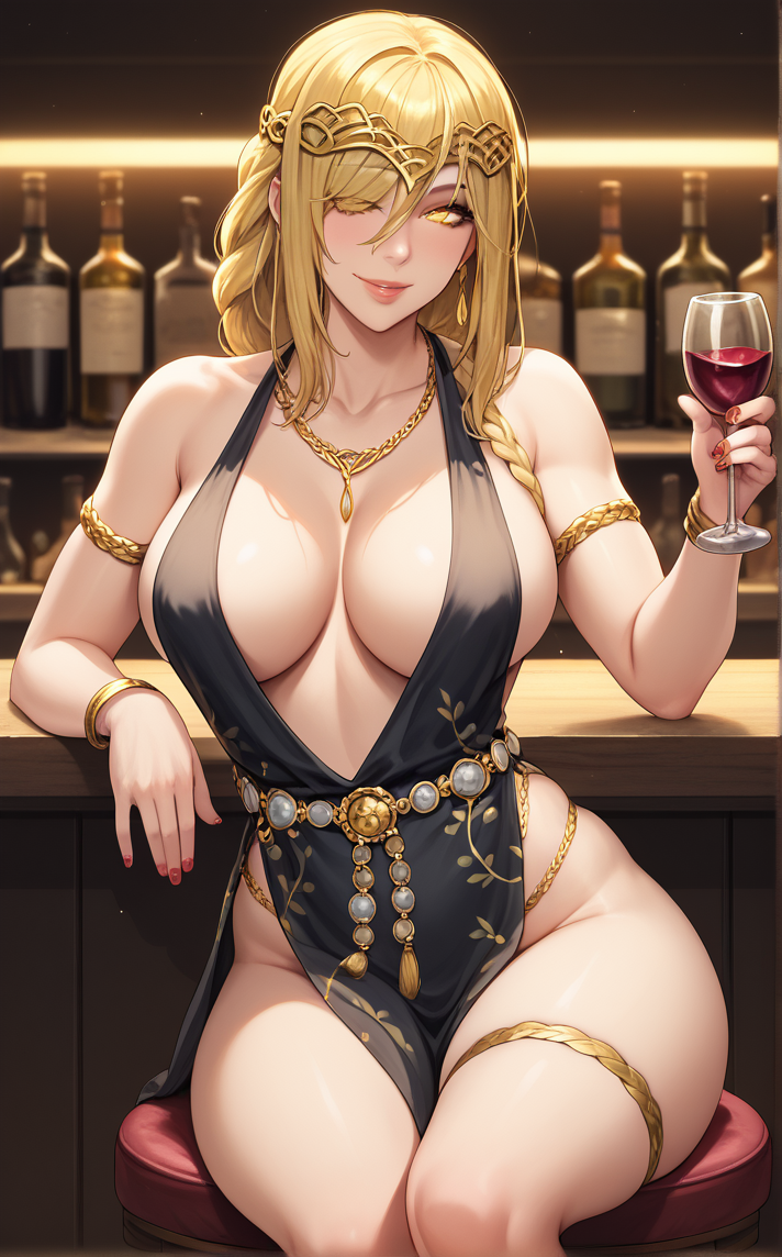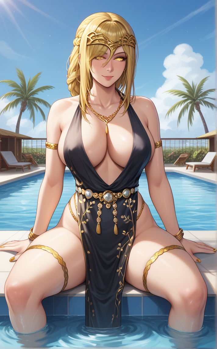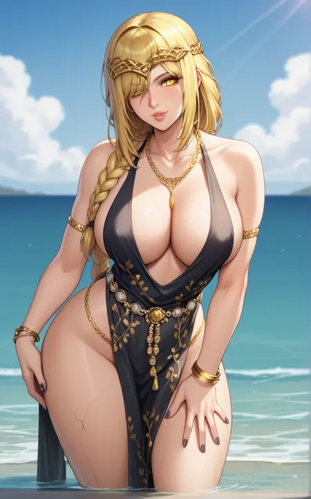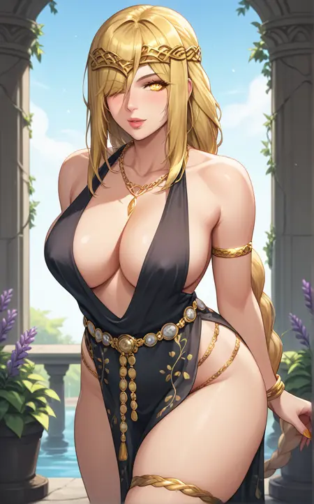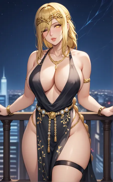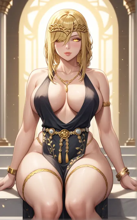 MAIN_QueenMarika_ownwaifu, 1girl, blonde hair, circlet, cracked skin, hair over one eye, necklace, pale skin, plunging neckline, ponytail, sidelocks, single braid, very long hair, yellow eyes, armlet, belly chain, floral print, gold, gold belt, jewelry, bare shoulders, lips, black dress, large breasts, cleavage, long hair, gold chain, gold necklace, sleeveless dress, gold bracelet, no bra, nose, long braid, pelvic curtain, braid, thighs, revealing clothes, braided ponytail, bracelet, collarbone, thighlet, side slit, center opening, nail polish, hair between eyes, hair over eyes, chain, makeup, no panties, belt, one eye covered, diadem, thigh strap, glowing eyes, gold trim, legs, eyelashes, thick thighs, hair ornament, bangs, cocktail dress, crack, curvy, mature female, bare legs, colored skin,
