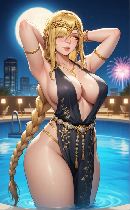 NSFW_QueenMarika_ownwaifu, 1girl, armlet, belly chain, blonde hair, circlet, cracked skin, gold belt, hair over one eye, jewelry, necklace, pale skin, ponytail, sidelocks, single braid, very long hair, yellow eyes, lips, large breasts, long hair, nipples, nude, completely nude, braided ponytail, long braid, braid, bracelet, thighlet, gold bracelet, gold chain, nose, nail polish, collarbone, pubic tattoo, shiny skin, pussy, chain, earrings,
