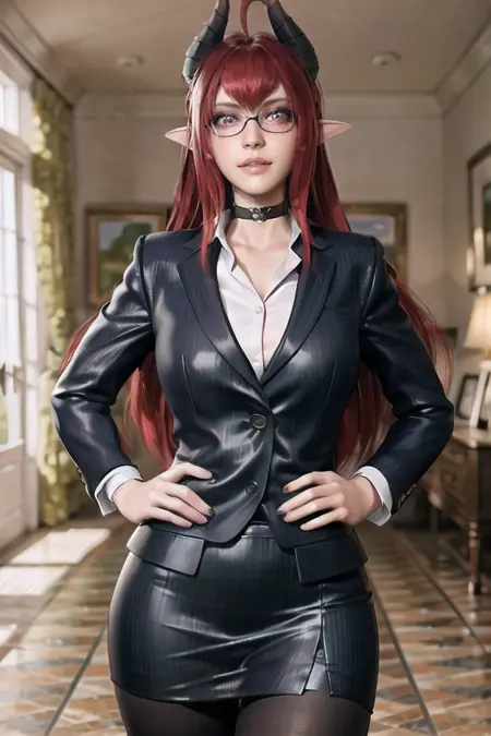 black_legwear, black_skirt, breasts, choker, demon_girl, demon_horns, glasses, horns, jacket, long_hair,miniskirt, pantyhose, pencil_skirt, pinstripe_pattern, pinstripe_suit, pointy_ears,red_hair, skirt, striped, striped_skirt, vertical-striped_skirt, vertical_stripes,