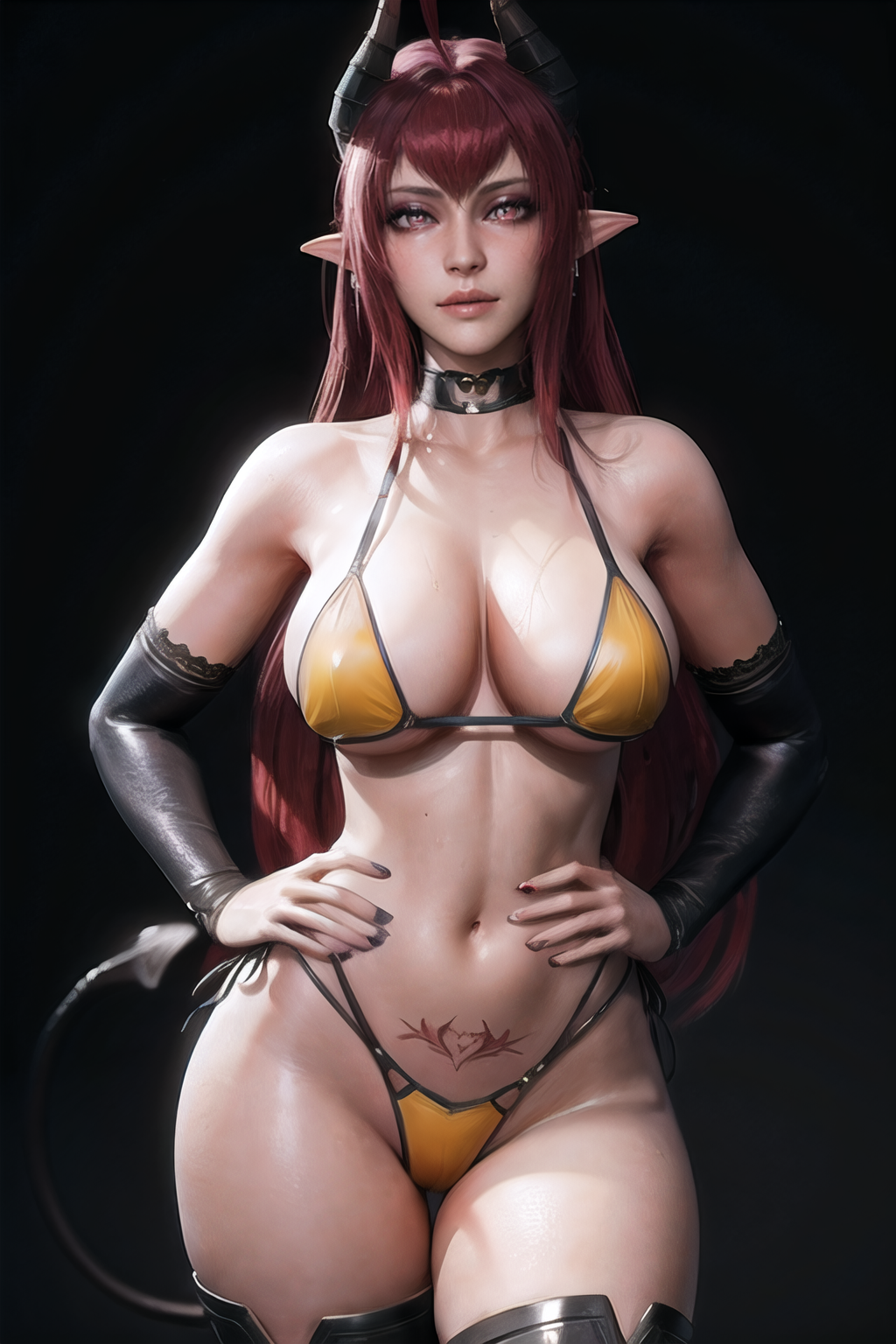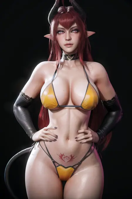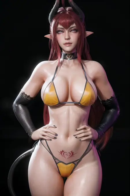 heart_tattoo, horns, lips, long_hair, makeup, large_breasts, nail_polish, navel, pointy_ears, pubic_tattoo, red_hair, stomach_tattoo, tail, tattoo,