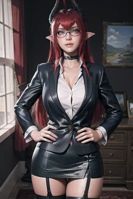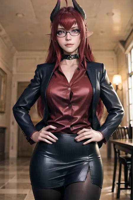 black_legwear, black_skirt, breasts, choker, demon_girl, demon_horns, glasses, horns, jacket, long_hair, miniskirt, pantyhose, pencil_skirt, pinstripe_pattern, pinstripe_suit, pointy_ears, red_hair, skirt, striped, striped_skirt, vertical-striped_skirt, vertical_stripes,