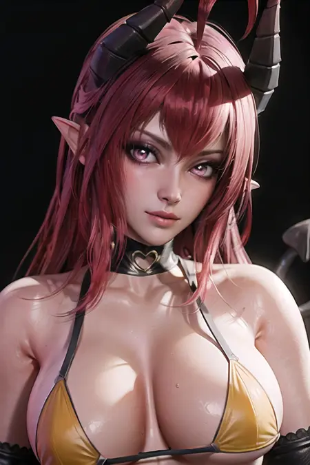 heart_tattoo, horns, lips, long_hair, makeup, large_breasts, nail_polish, pointy_ears, red_hair,
