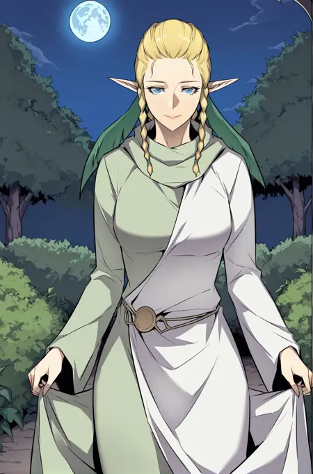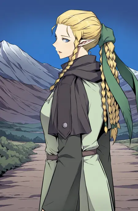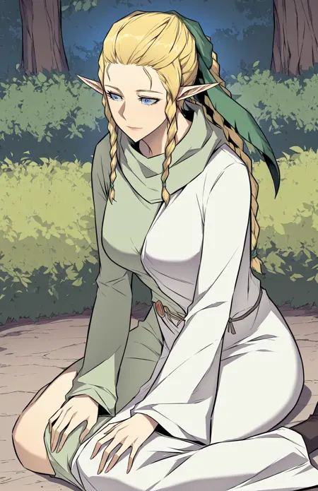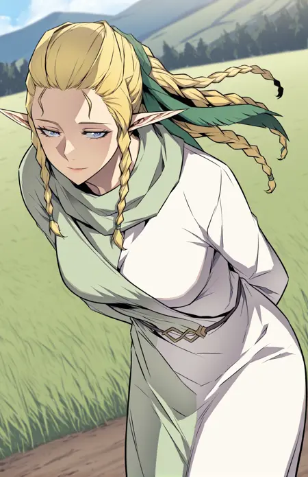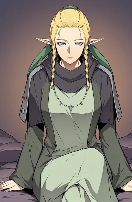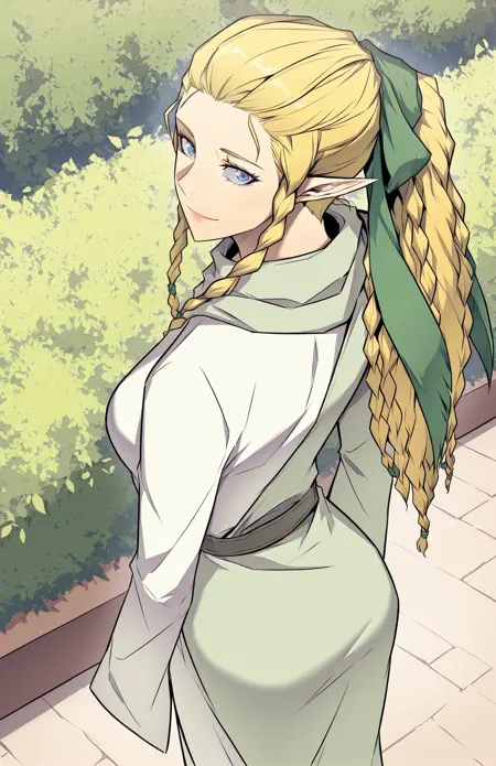 | Trained Words | Siacks, 1 girl, solo, elf, pointed ears, blue eyes, blond hair, long hair, braided hair, twin braids, multiple thin braids tied into ponytail, green ribbon, hair ribbon tie, intricate braids,Copied! Siacks_outfit1, long light green robe, dark inner sleeves, long sleeves, shoulder mantle, buttoned shoulder flaps, layered outerwearCopied! Siacks_outfit2, asymmetrical dress, long bicolor robe, dual-tone robe, long-sleeve robe, ankle-length robe, white and green outfit, pale green and white dress, flared sleeves,Copied! |