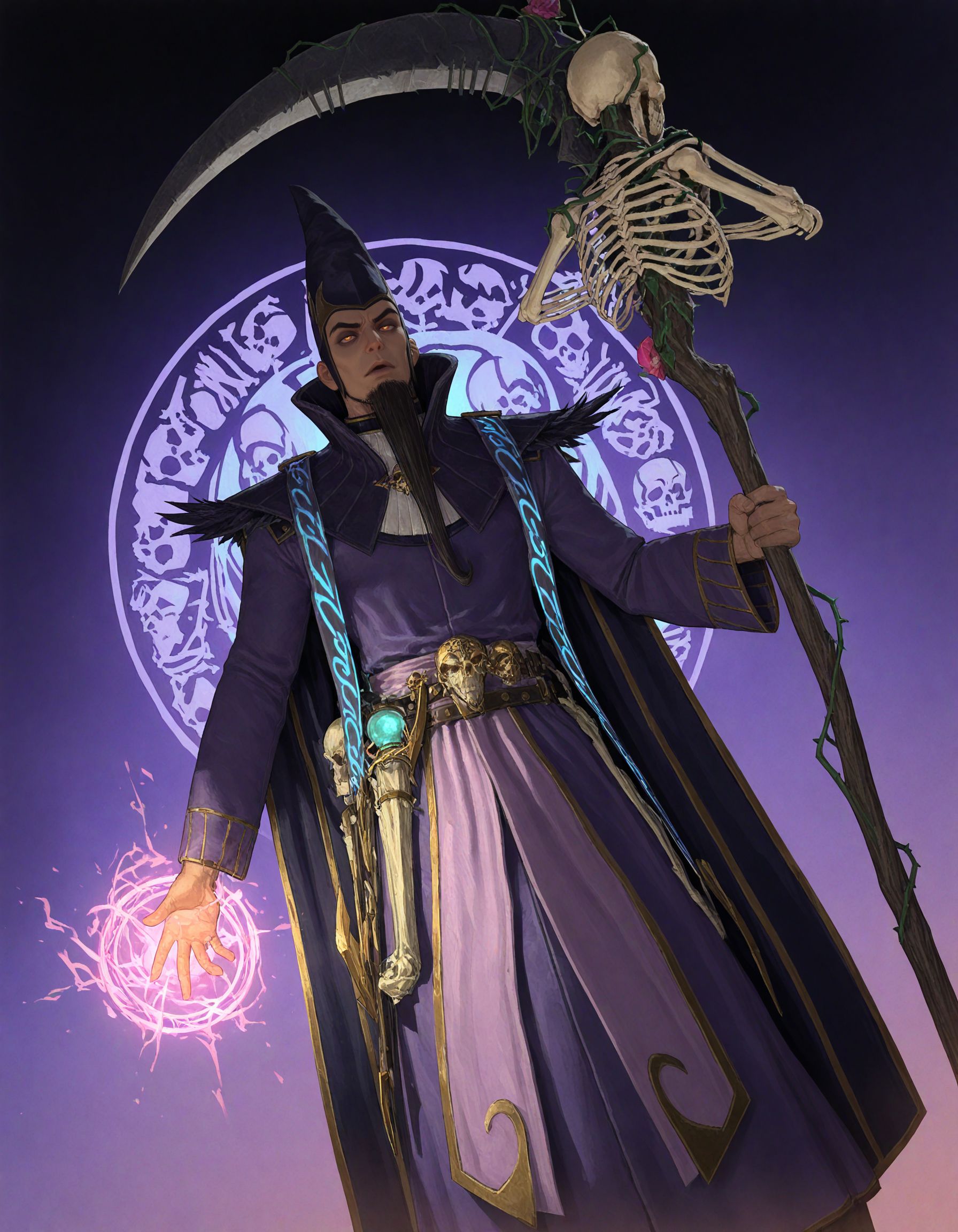 AmethystWizard, hat, male focus, 1boy, beard, scythe, skull, skeleton,