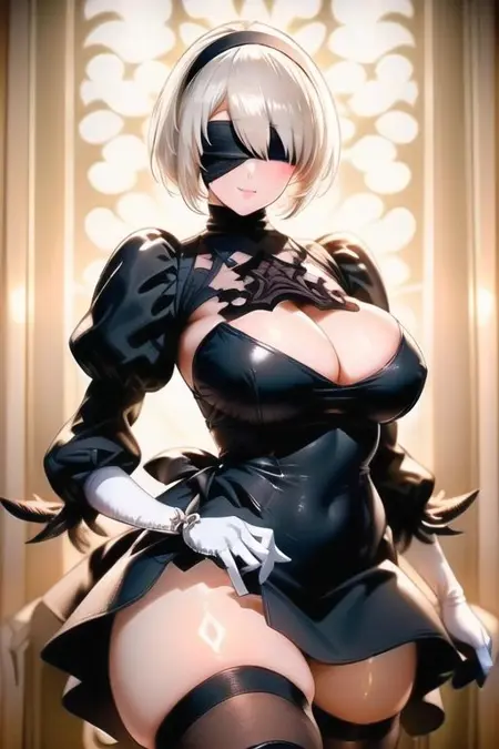 Trigger word: 2b_a, short hair, hair over one eye, white hair, mole under mouth, hairband, black blindfold, turtleneck, puffy long sleeves, feather-trimmed sleeves, elbow gloves, black dress, cleavage cutout, clothing cutout, black thigh boots, gloves,