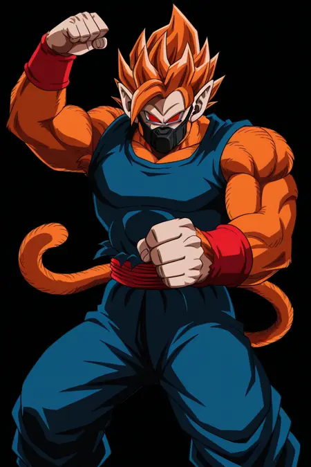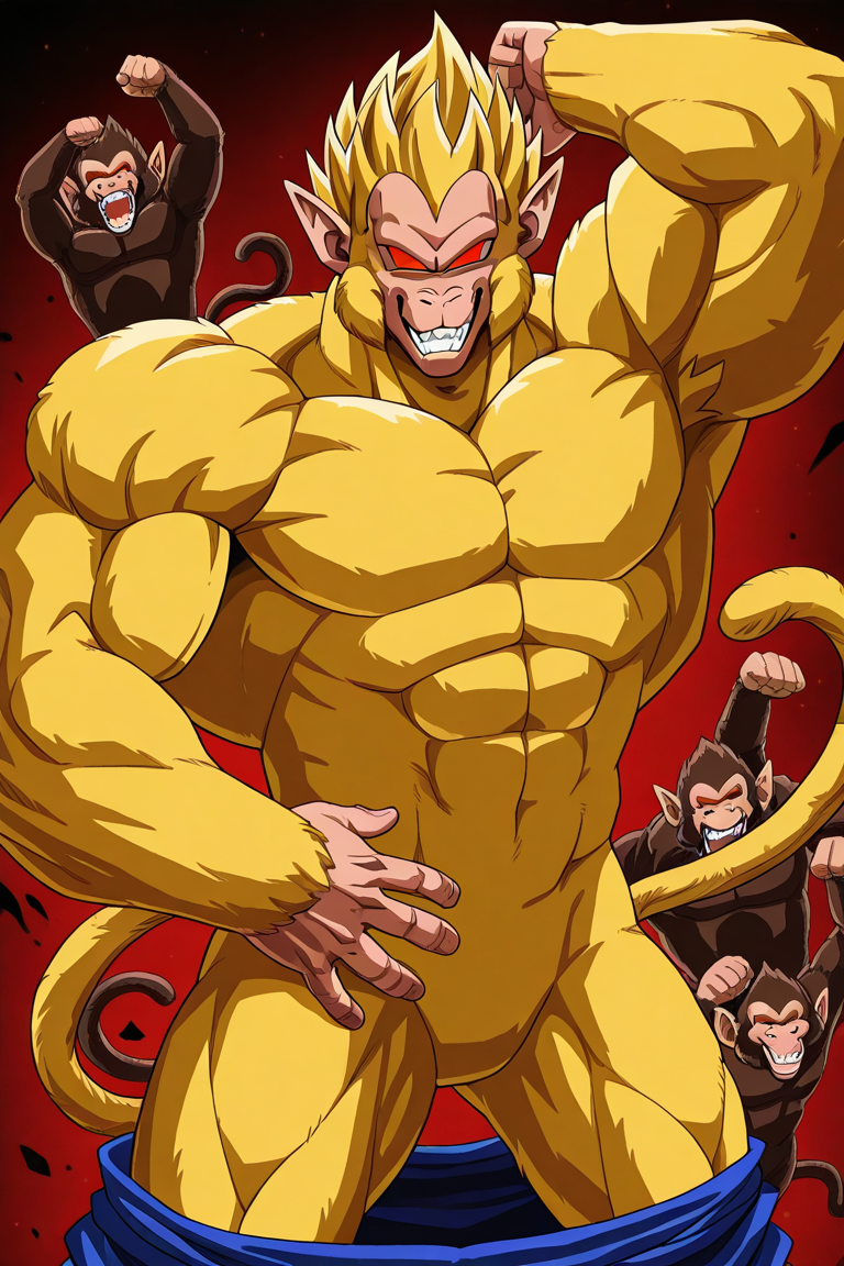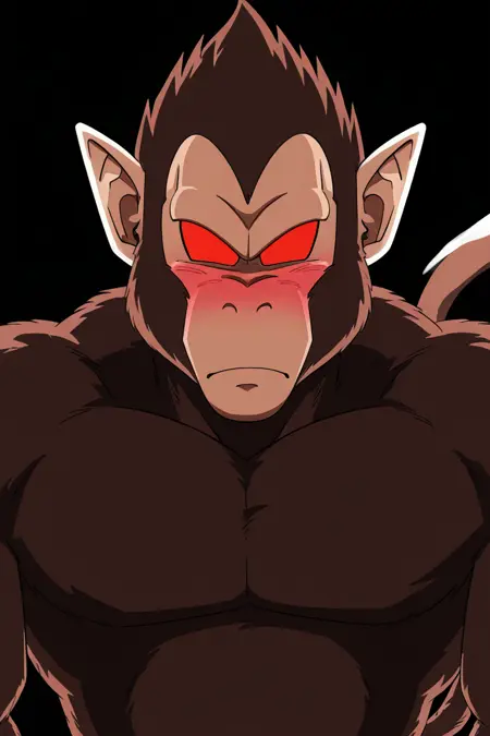 Score_9, Score_8_up, scate_7_up, anime origin, solo, 1male, monkey, Saiyan, ozaru, Red eyes without pupils, pointed ears, Brown fur, Tail,