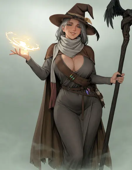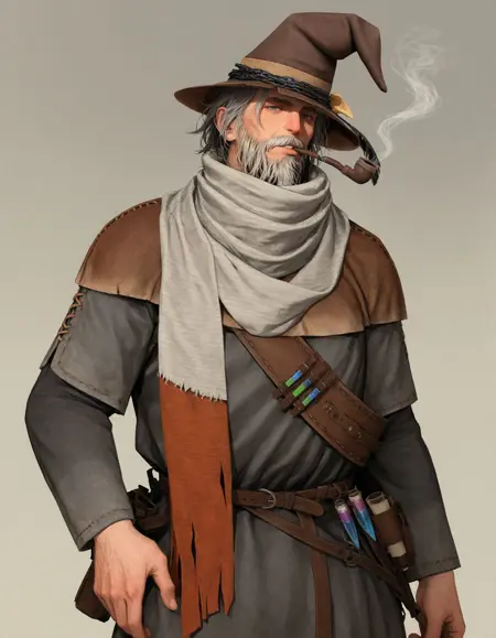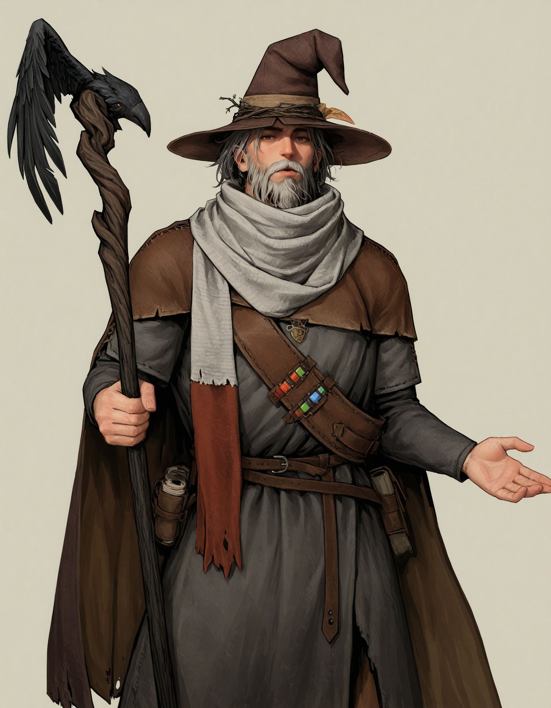 GreyWizard, male focus, cape, hat, scarf, cape, staff,