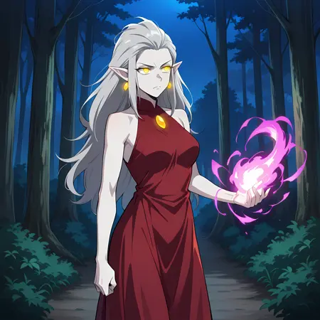 Original Appearance: pointy ears,colored skin, pale skin, grey hair, long hair, yellow eyes,jewelry, earrings, red dress, sleeveless dress, bare shoulders, boots, chest jewel