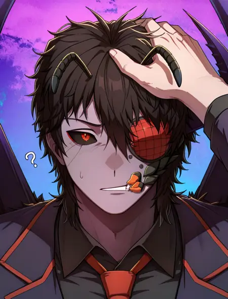 antennae, single horn, mandibles, mask, black sclera, red eyes