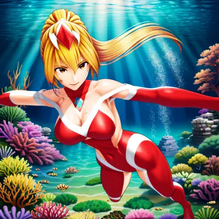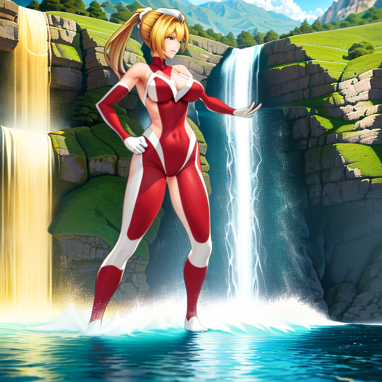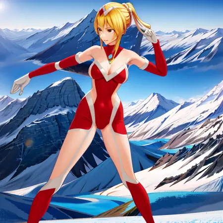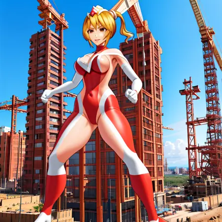 Create Ultraman heroine girl Dyna version of Red, popularly known as Lora. To give the vibe of a giant, the background is designed to look miniaturized. This includes settings of a city, amusement park, snow mountain, underwater, space, waterfall, and construction site.