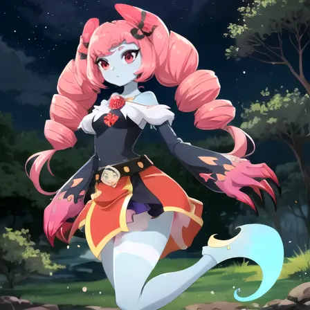 3. Activation tag is Fayemelina and tags to help: 1girl, solo, long hair,skirt, belt, no humans, colored skin, claws, ghost, blue skin, fusion, ghost tail, pink hair, twin drills,