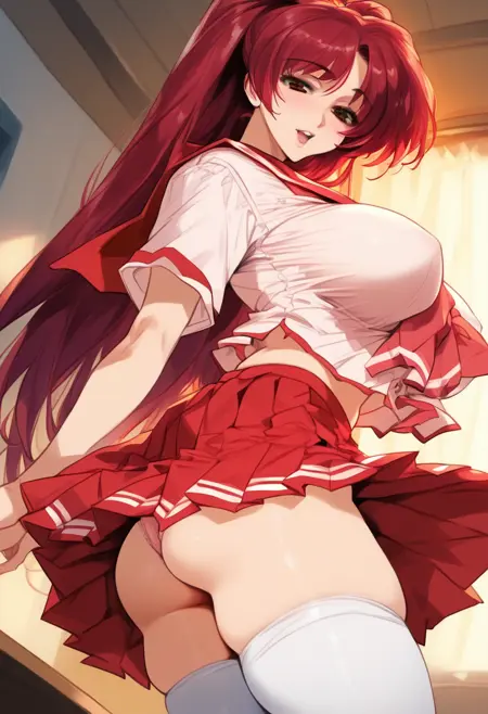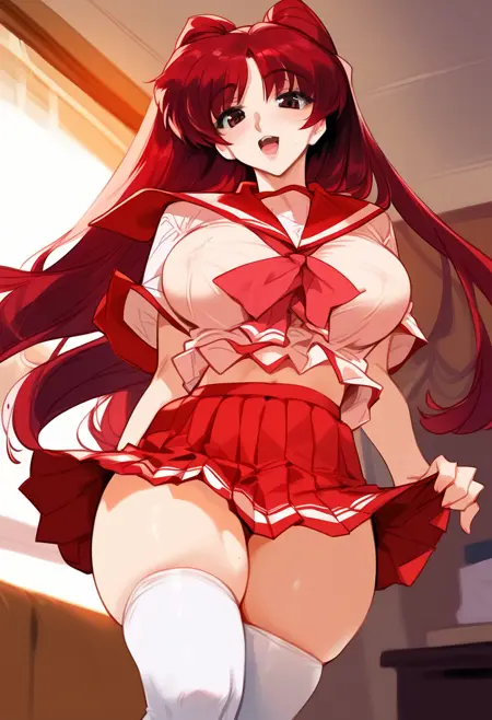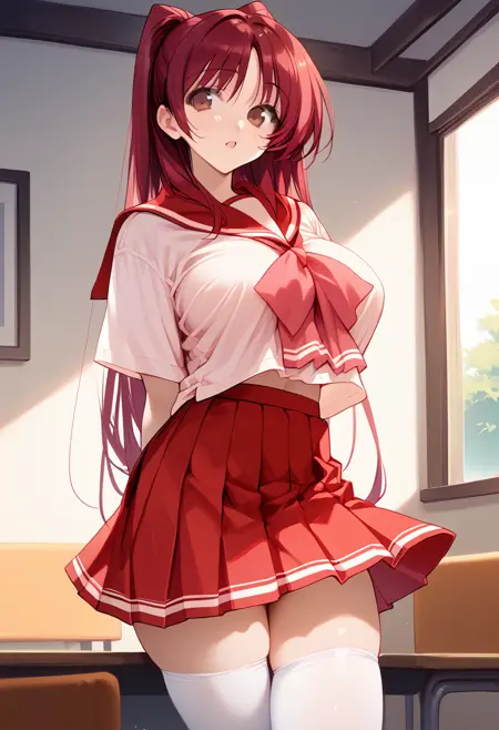 red hair female, long hair, large breasts, brown eyes, serafuku, white thighhighs, pleated skirt