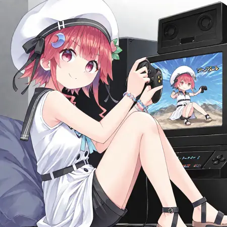 Hashino_夏季校服,红色发饰,白色头饰,黑色丝带,腰部白色丝带,白色连衣裙,黑色短裤,凉鞋,黑色水手领,纽扣,单只手镯,
