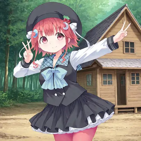 Hashino_冬季校服,红色发饰,蓝色水手领,格子水手领,粉红色连裤袜,黑色头饰,蓬裙,黑色裙子,白色花边,多彩裙子,黑色背心,蓝色胸结,白色袖子,白色丝带,靴子,