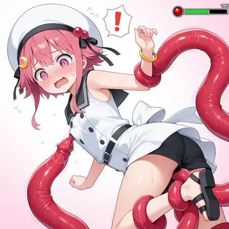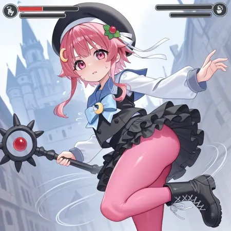 recommended prompt: pink hair, short hair, pink eyes, long sidelocks, curvy sidelocks, single crescent,