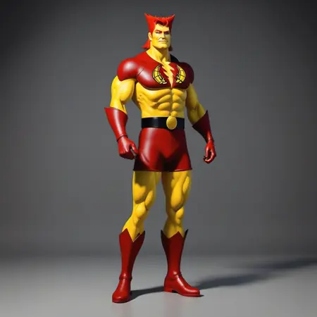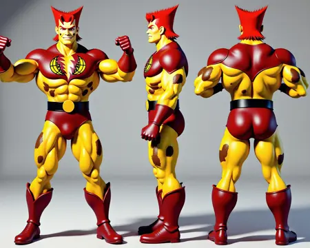 肯定的タグ:captpollution, cpollu, captpollu, muscular male, villain, yellow character, yellow skin, vibrant yellow skin, yellow face, vibrant yellow face, brown mud spots on face, brown mud spots on skin, brown spots on skin, mud on skin, red spiky hair, vibrant red hair, vibrant red spiky hair, red eyebrows, red pupils, cracked yellow emblem, yellow emblem on chest, short red shorts, black belt, yellow belt buckle, red boots