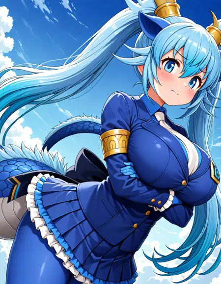| 训练词汇 | seiryuu (kemono friends),animal ears,blue eyes,twintails,long hair,very long hair,blue hair,dragon tail,huge breasts,blue shirt,collared shirt,blue jacket,long sleeves,armband,white necktie,blue gloves,pleated skirt,blue skirt,frilled skirt,blue pantyhose已复制! |
