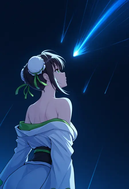 L1ang, green eyes, black hair, double bun, bun cover, sidelocks