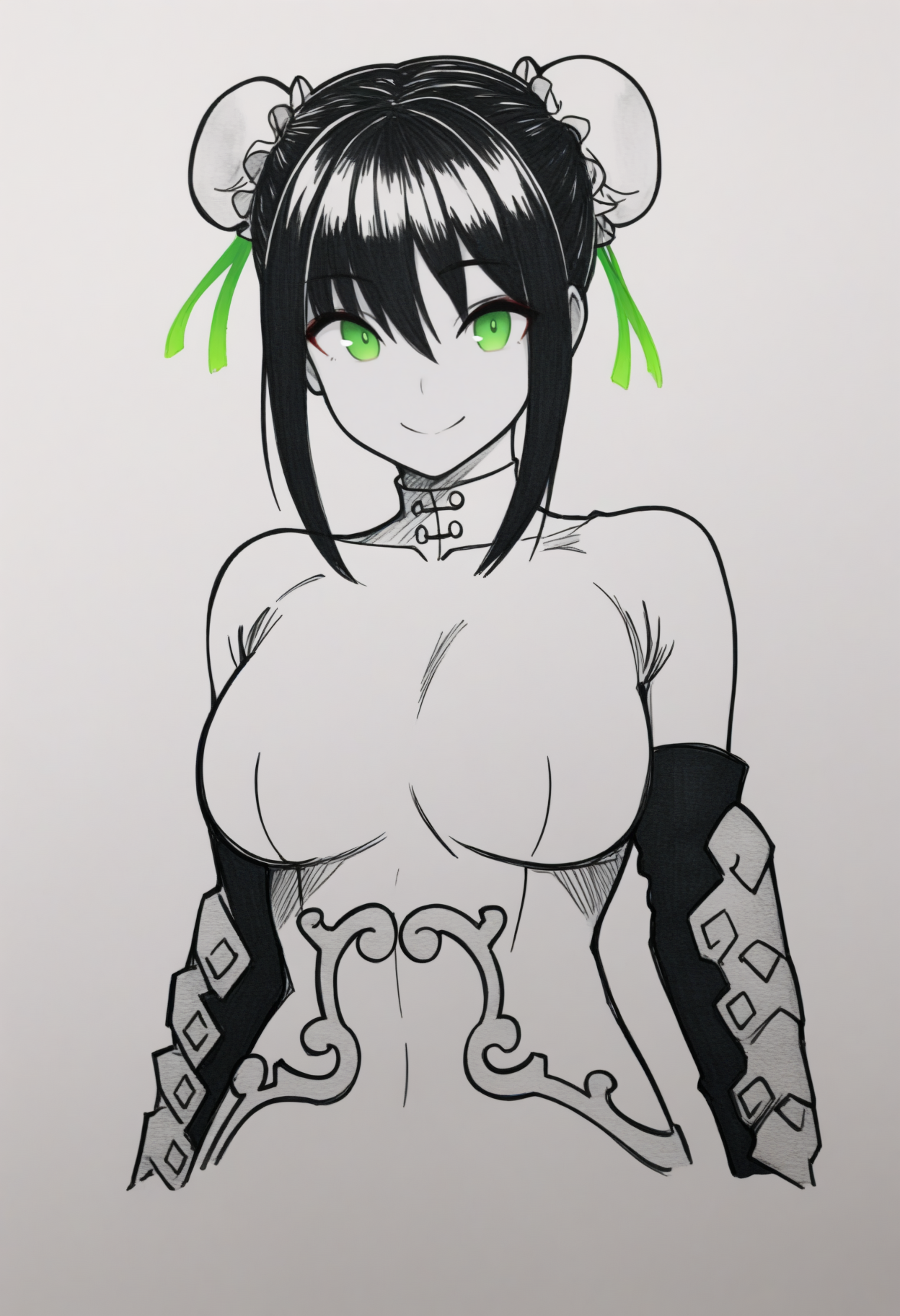 L1angDef, green eyes, black hair, double bun, bun cover, sidelocks, multicolored bodysuit, white bodysuit, black bodysuit, skin tight, fingerless gloves, arm guards