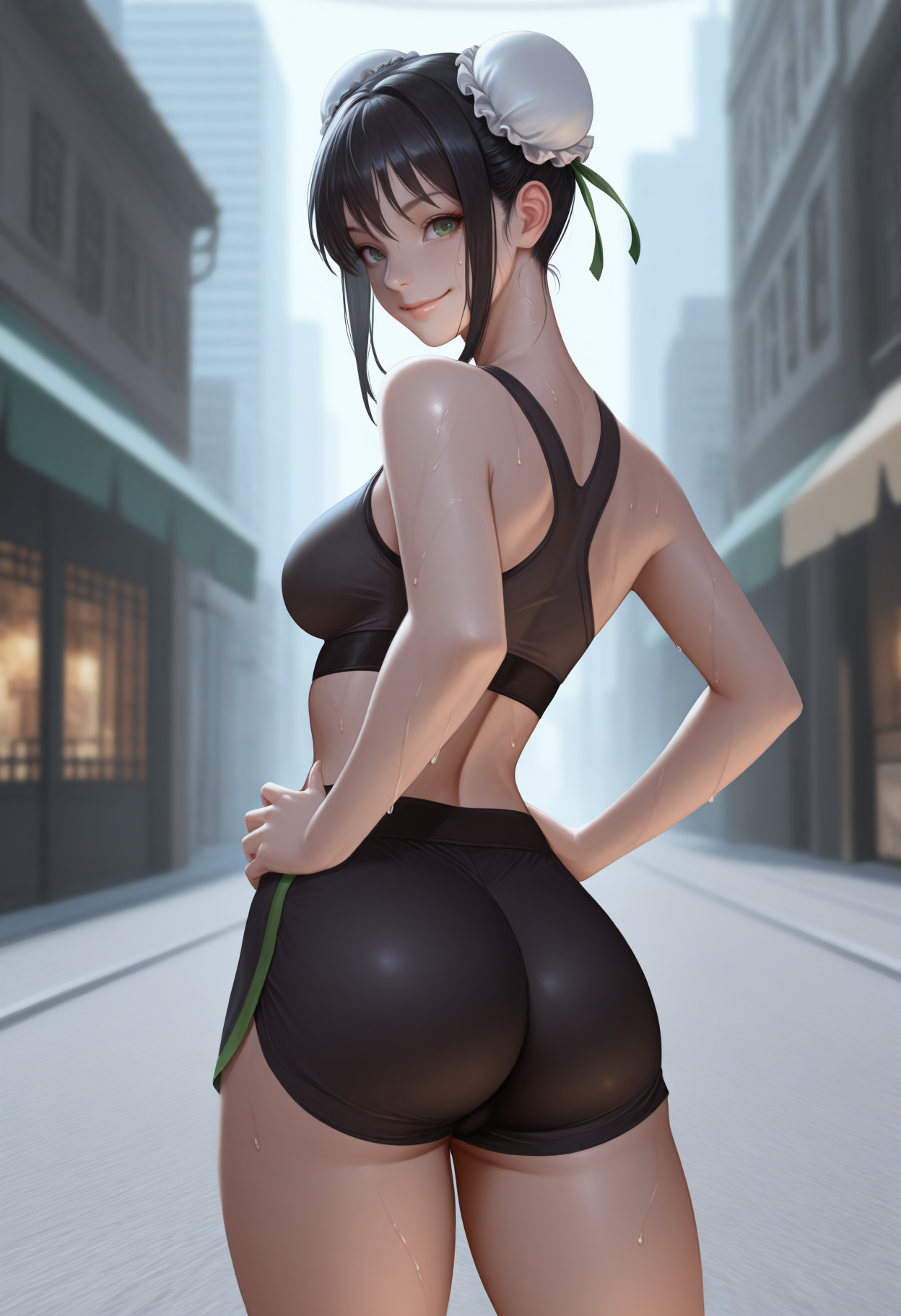 L1angCotD, green eyes, black hair, double bun, bun cover, sidelocks, green bikini, white jacket, open jacket, black shorts, torn shorts, black belt, sleeveless shrug \(clothing\)