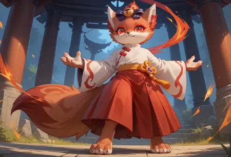 Li, 女性兽人,狐狸,长袖,小乳房,丝带,日式服装,衬衫,橙色眼睛,爪子,红裙,红色眼影,尾巴上有标记,耳朵上有绒毛痕迹,