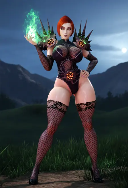 highleg 레오타드, 어깨 스파이크, 어깨 갑옷, 레이스 트림, 검은 허벅지 스타킹, 피시넷 허벅지 스타킹, 분리형 피시넷 소매, 피시넷 컷아웃, 하이힐, 검은 신발