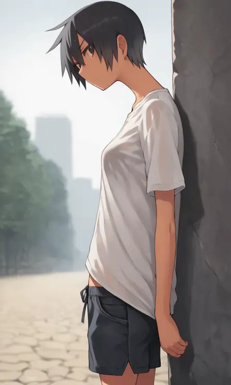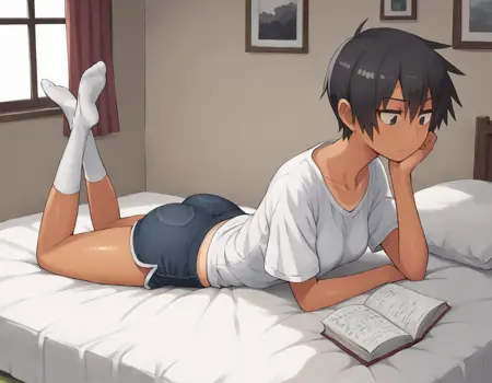 kuronamisan, black hair, black eyes, short hair, one-piece tan