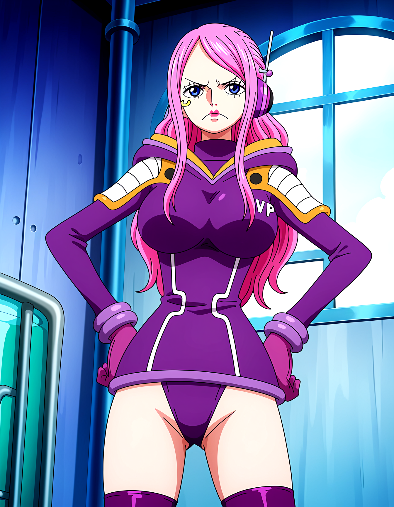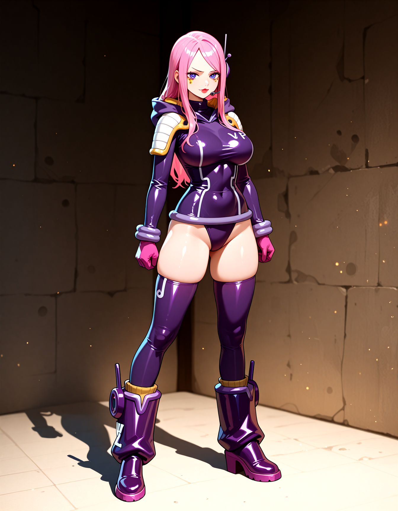 Egg Head Outfits: VP outfits, bodysuit, leotard, hood down, shoulder pads, gloves, headset, purple thighhighs,