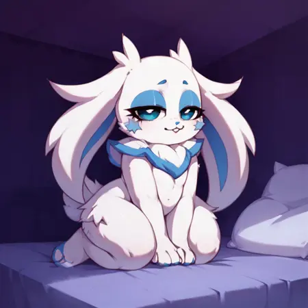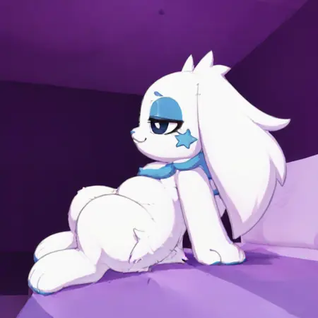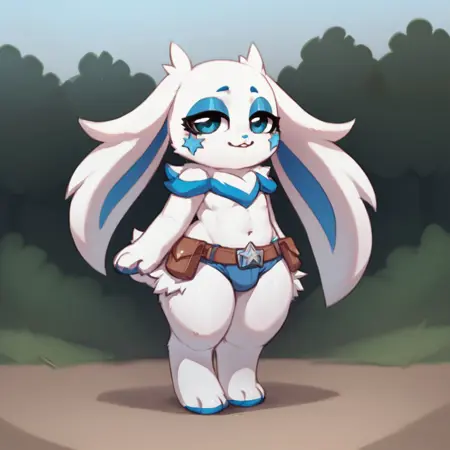 Fluff(character), rabbit, short stack, femboy, stars on cheeks, blue eyelids,