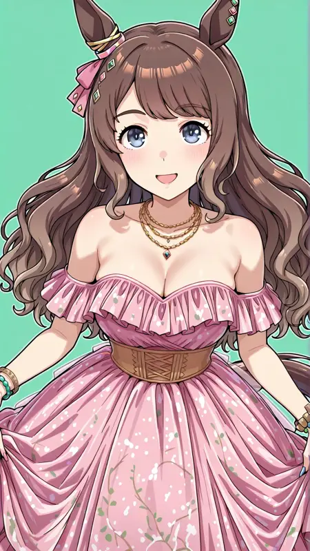 horse ears,long hair,horse girl,horse tail,brown hair,blue eyes,ear ornament,bangs,ribbon,hair ribbon,sidelocks,Aurore Vacances,jewelry,official alternate costume,bare shoulders,necklace,pink dress,off-shoulder dress,cleavage,ear ornament,bracelet,
