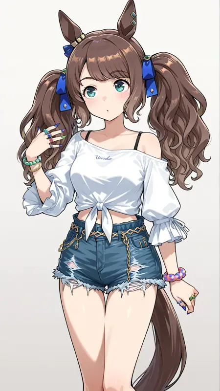 horse ears,long hair,horse girl,horse tail,twintails,brown hair,blue eyes,ear ornament,bangs,ribbon,hair ribbon,sidelocks,