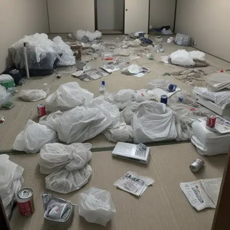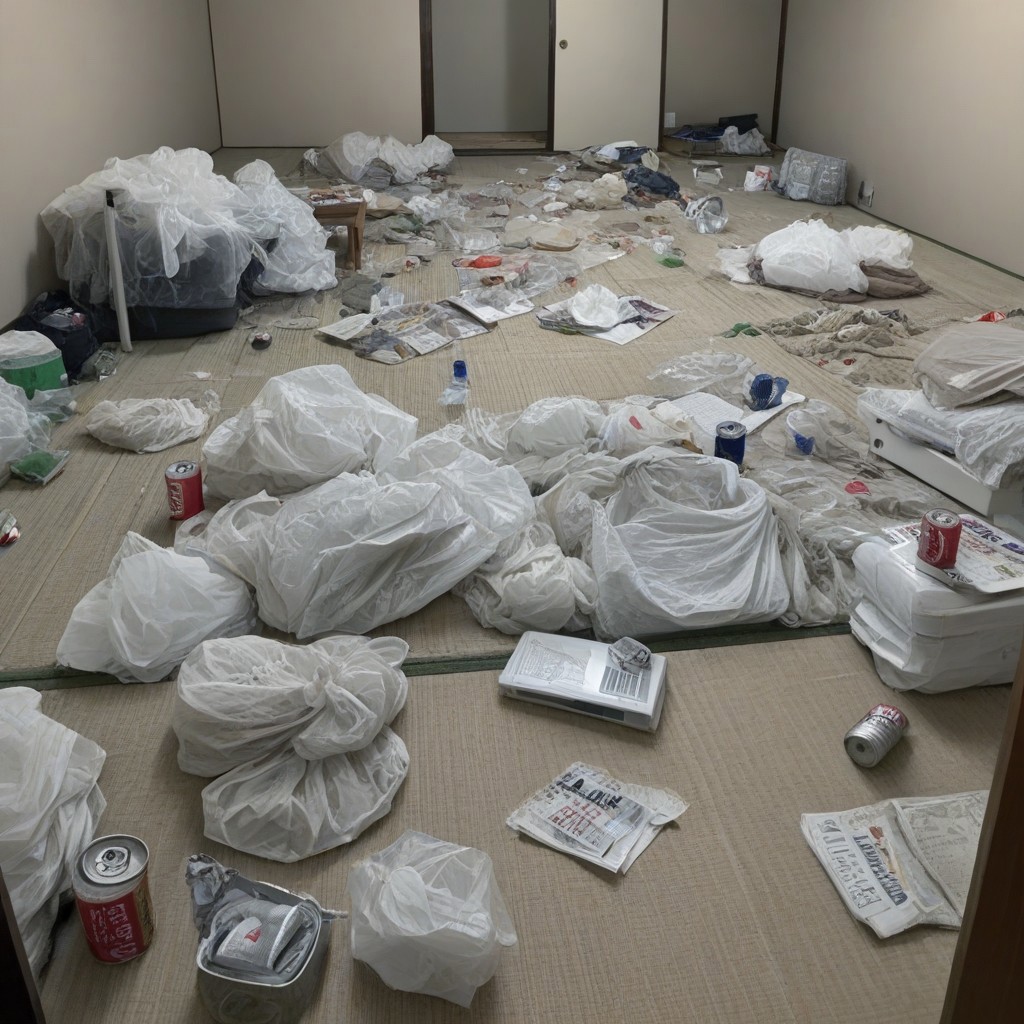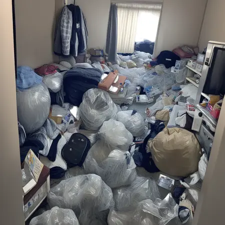 messy room, dirty room, plastic bottles, cans, plastic bags, magazines, tissues, undressed clothes,